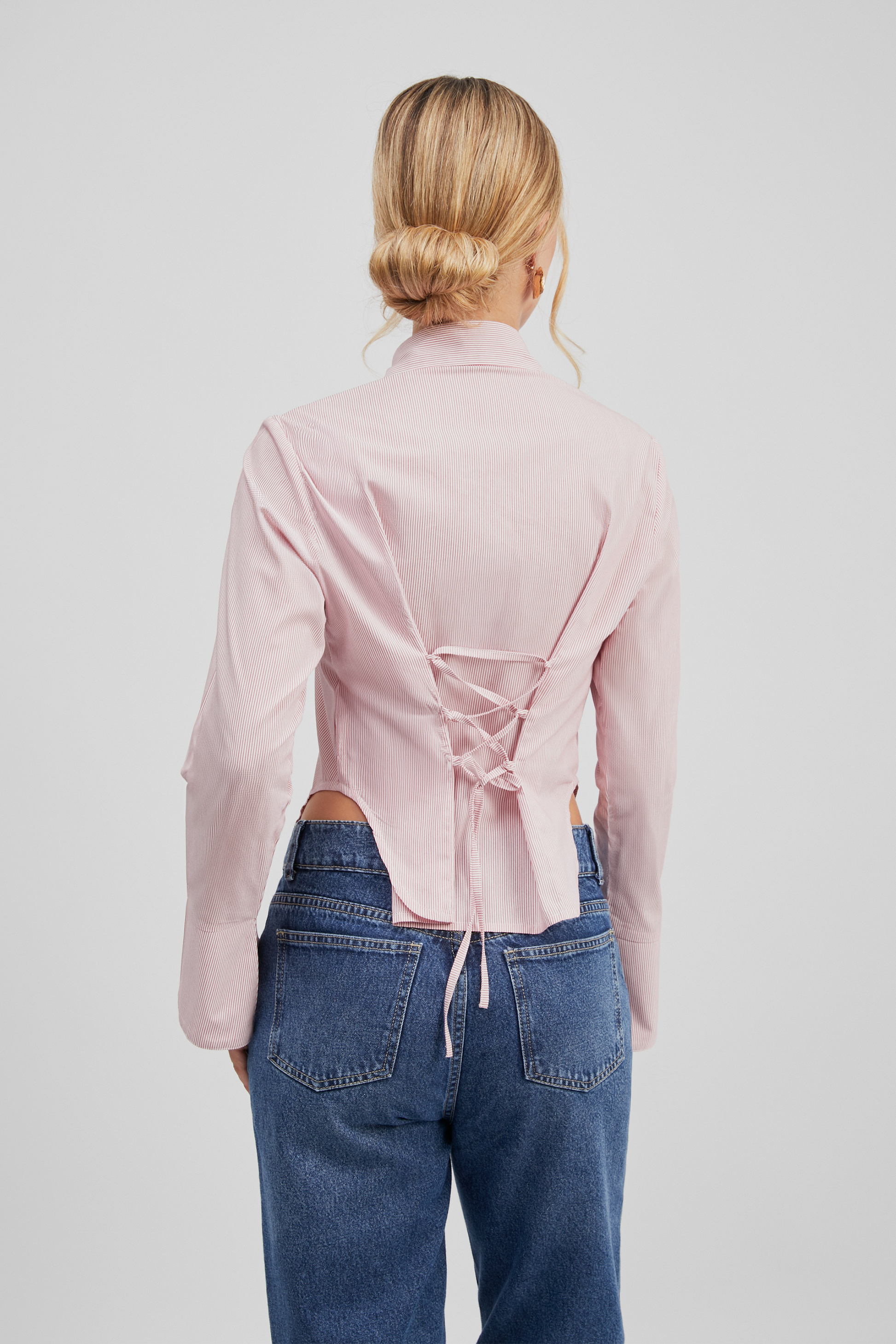 Camisa entallada con detalle lace-up en espalda que realza la figura y suma un toque inesperado. Ideal para llevar del office al after sin perder el estilo.