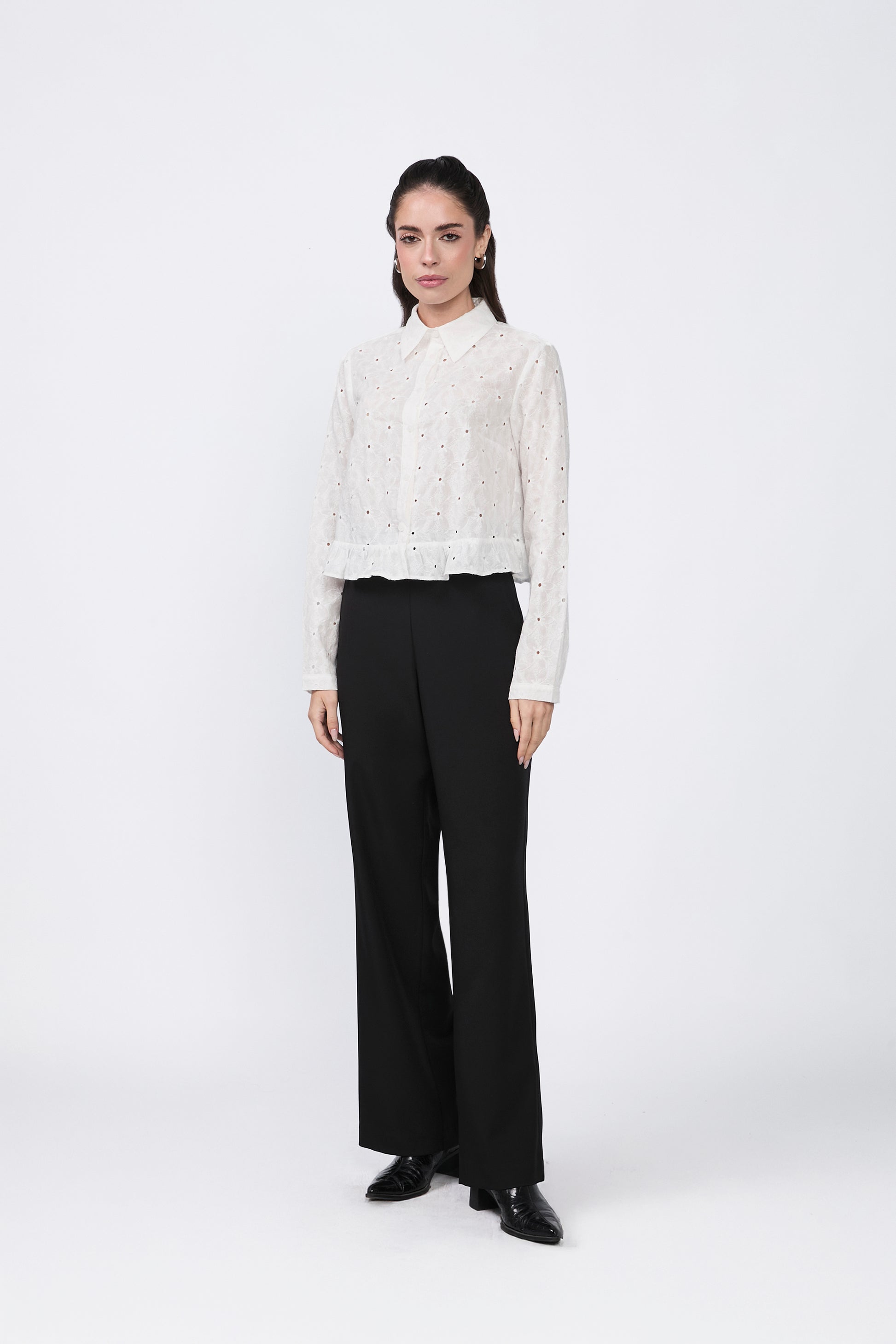 La Blusa Ella se distingue por su encanto delicado y femenino. Diseñada con manga larga y un sutil detalle de volados en la basta, aporta movimiento y suavidad a tu silueta. Su corte clásico, acompañado por el toque artesanal del broderie, la convierte en una prenda ideal para quienes buscan un equilibrio entre lo romántico y lo casual.