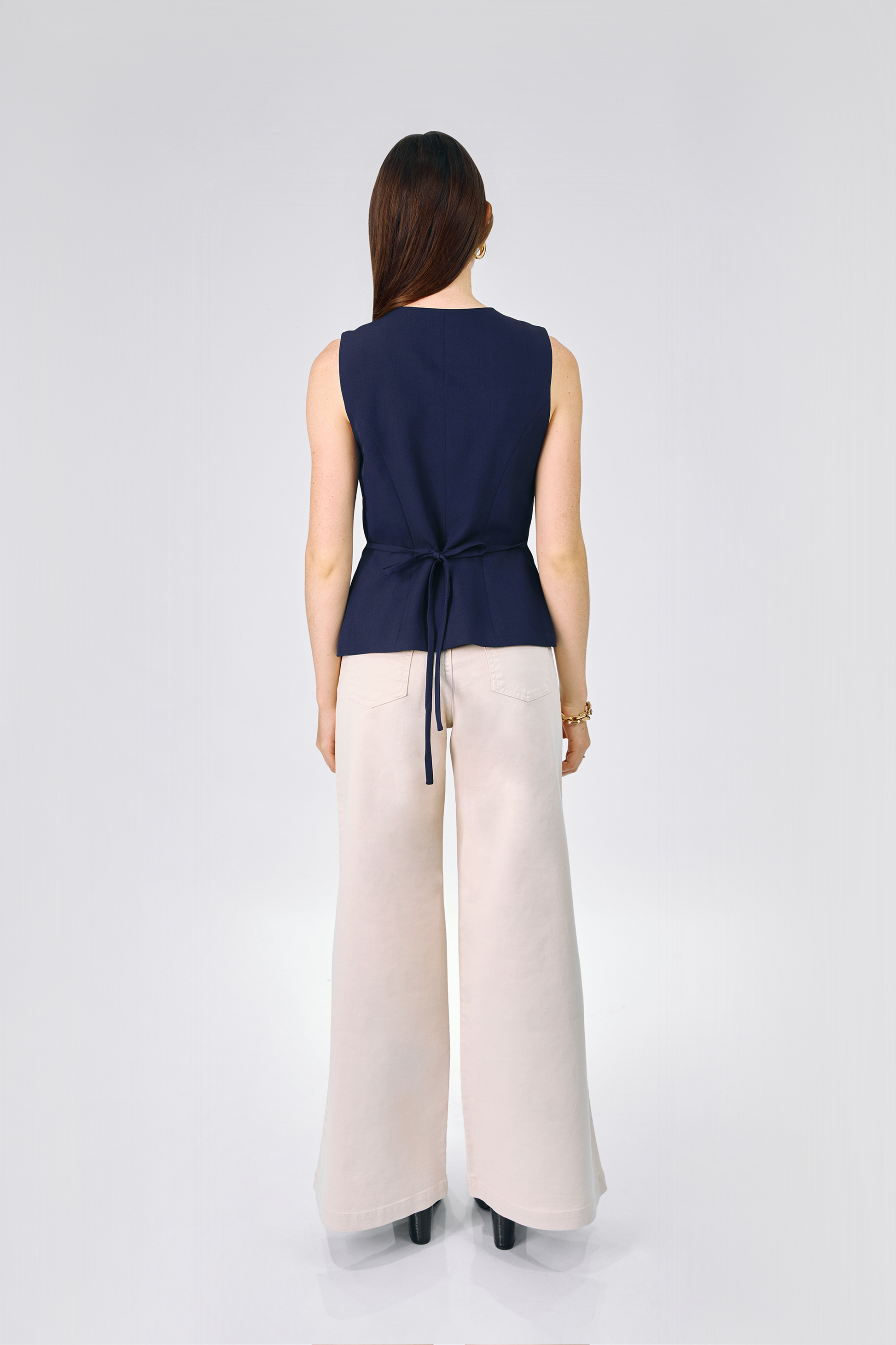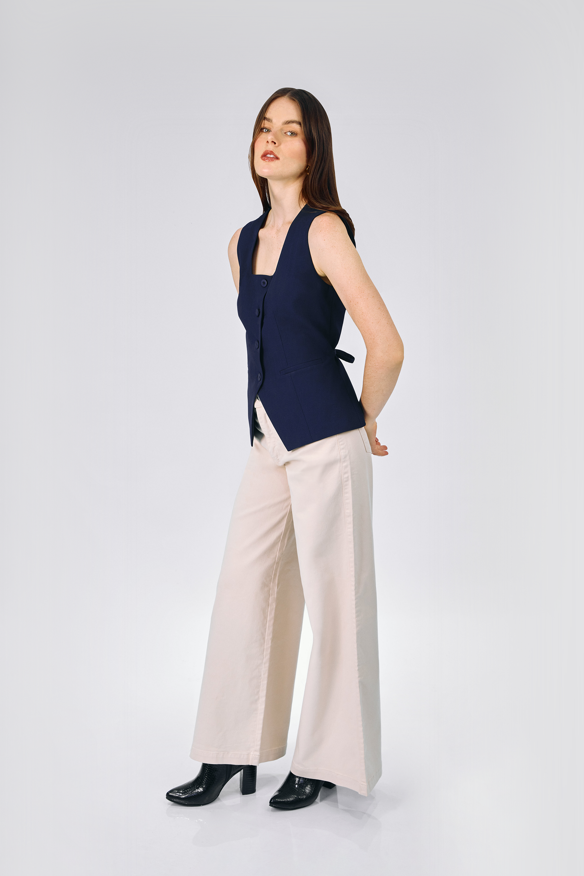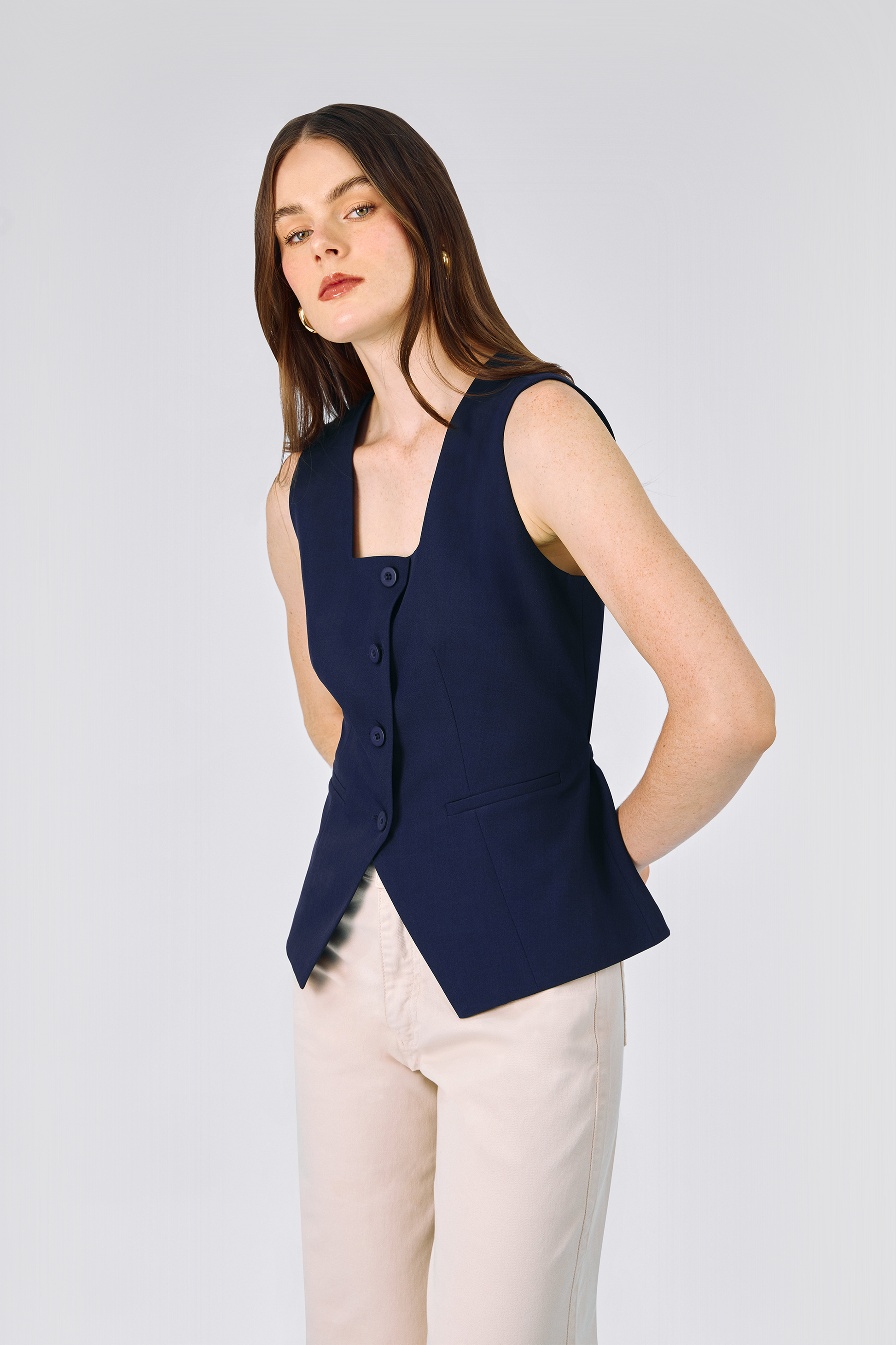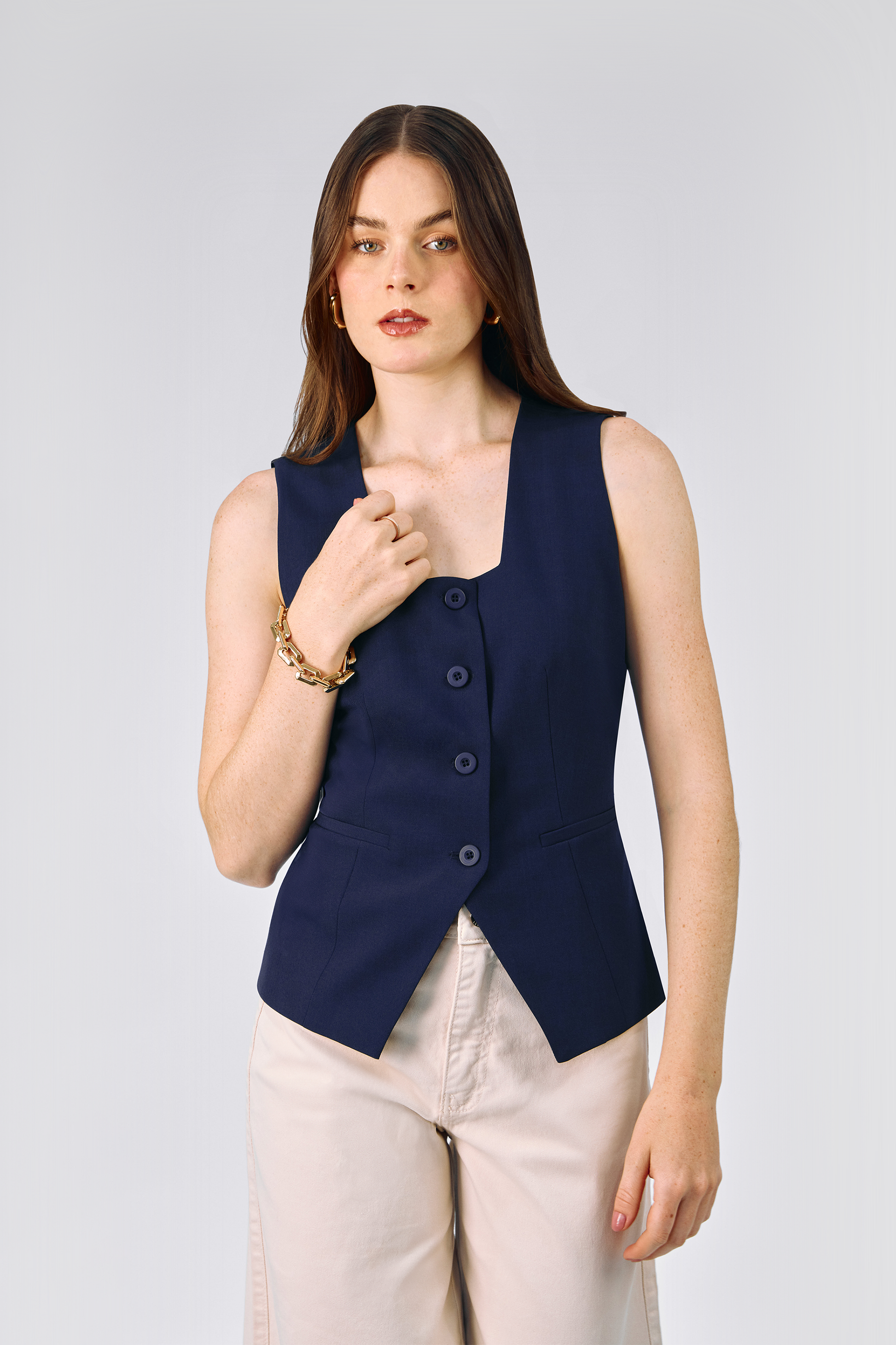 Luce impecable con este chaleco sastrero de escote cuadrado, que destaca por sus botones frontales y detalles de tiras en los costados, aportando estilo y distinción a tu outfit.