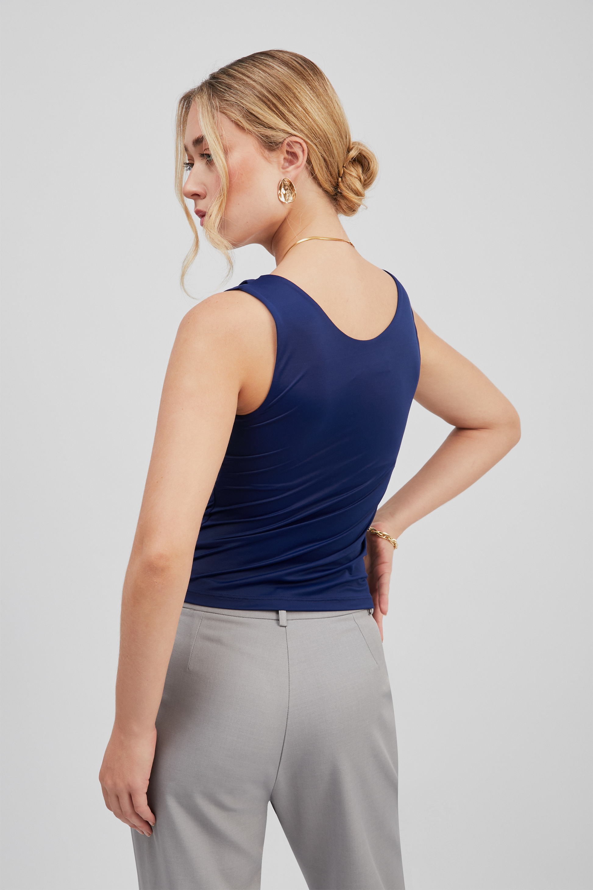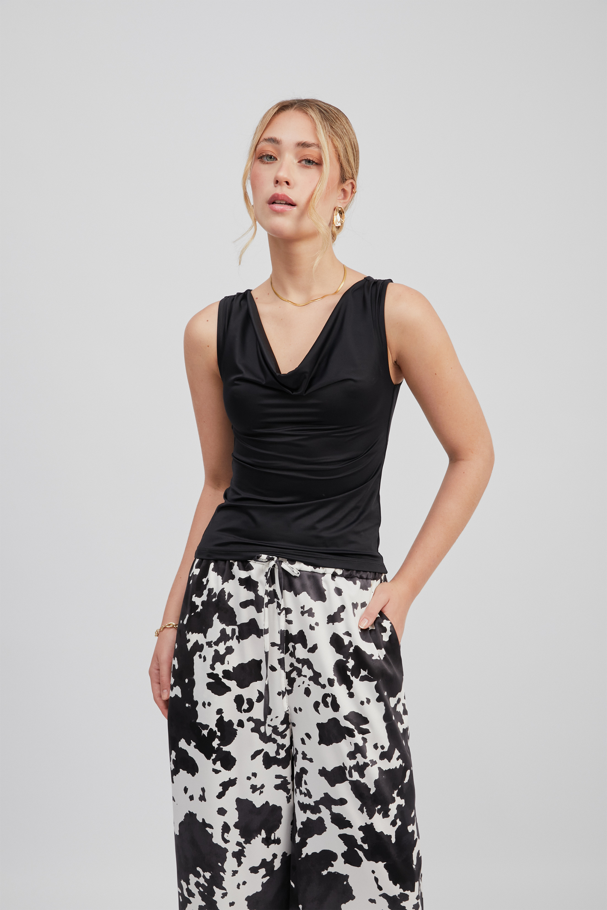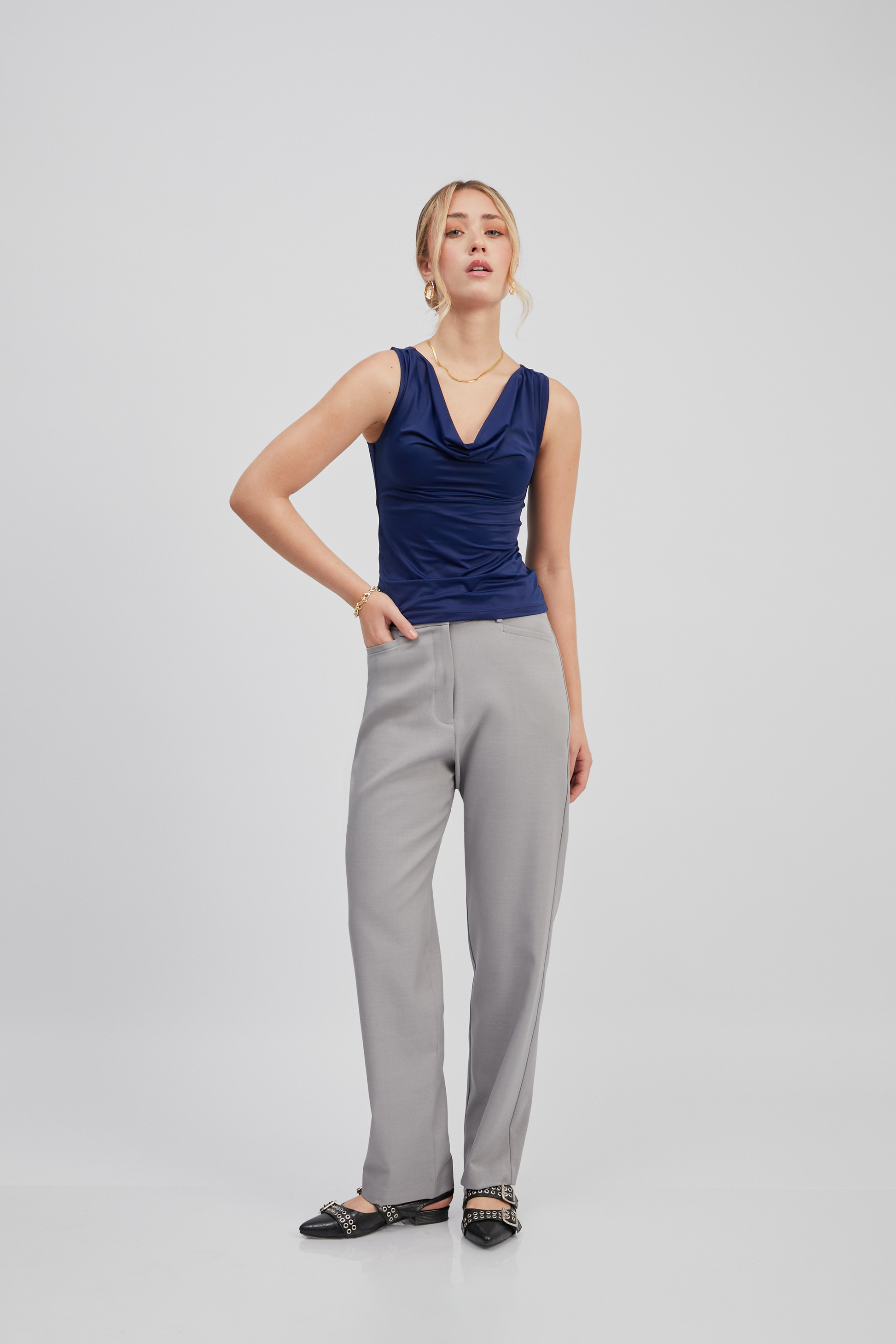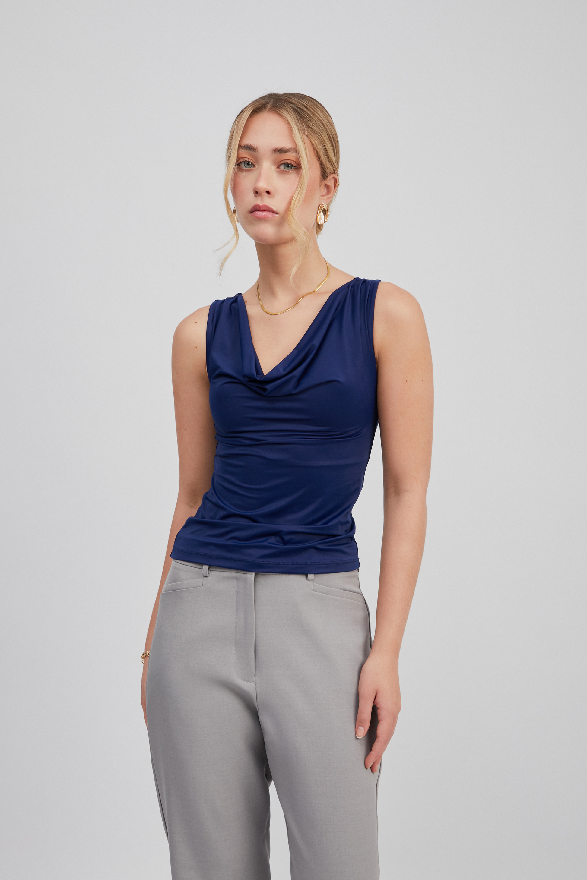 Escote drapeado con caída sutil que resalta el cuello y realza tu figura. Llévala del trabajo a la noche con solo cambiar los accesorios.